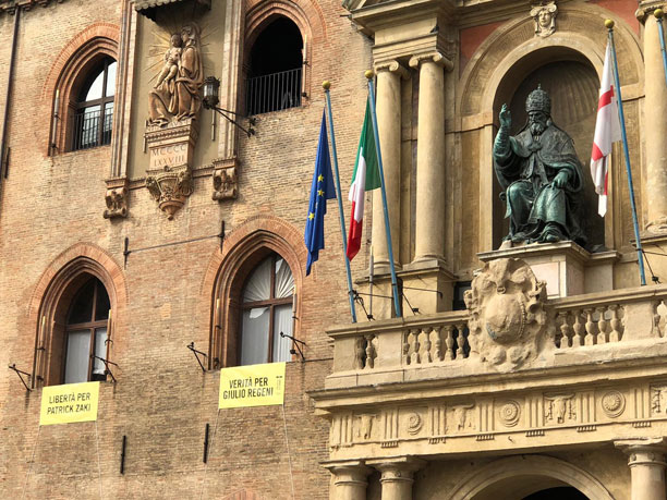 BOLOGNA. Dalla mattina di oggi, giovedì 5 marzo, sulla facciata di Palazzo d’Accursio sede del Comune di Bologna è esposto uno striscione con la scritta “Libertà per Patrick Zaky”, accanto a quello di Amnesty International per chiedere “Verità per Giulio Regeni”.