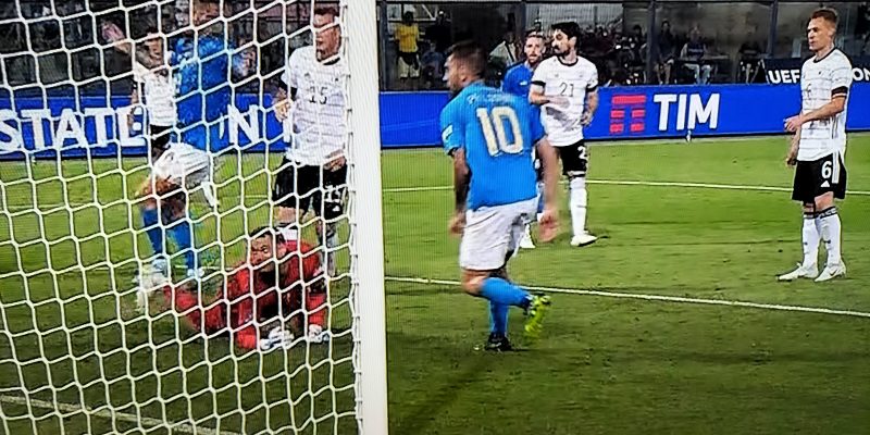 Poi pian piano gli azzurri prendono coraggio e riescono a rendersi pericolosi grazie ad alcune iniziative di Pellegrini e del debuttante Frattesi. Quest’ultimo dimostra verve e personalità e riesce ad andare un paio di volte al tiro. Al 35′ l’Italia colpisce l’esterno del palo con Scamacca. Al 38′ la Germania va vicino al vantaggio con un’azione insistita in area e la conclusione del suo numero 10 appena sopra la traversa.