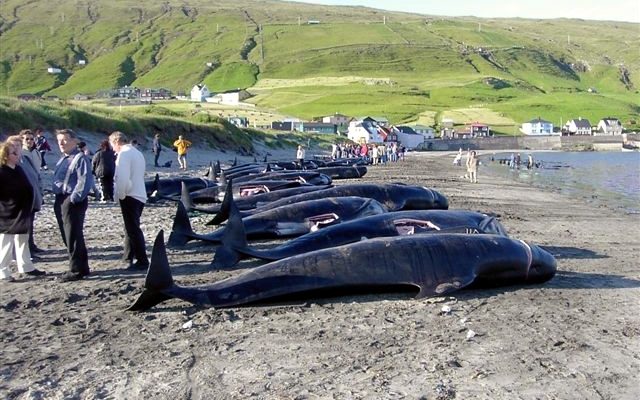 Ben 1500 delfini sono stati incanalati nella insenatura davanti alla spiaggia di Skálabotnur sull’isola di Eysturoy e poi uccisi con coltelli, arpioni, persino con strumenti a trapano particolarmente dolorosi.