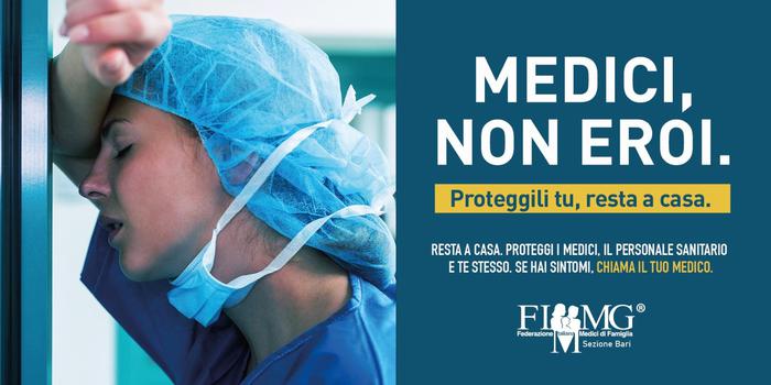 Ed è ispirandosi a quelle immagini che la Fimmg Bari ha deciso di lanciare la campagna ‘Medici, non eroi’, per invitare i cittadini al distanziamento sociale. “Proteggili tu, resta a casa”, recitano i banner che verranno diffusi sui canali social a partire da oggi e che riportano immagini di medici sfiniti.