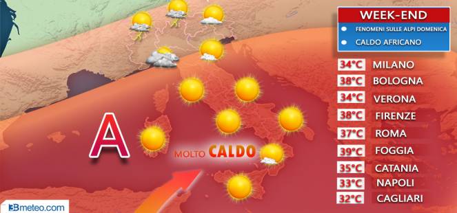 Domenica: l’anticiclone africano raggiunge la sua massima espansione sull’Italia centrale con massime fino a 39°C in Toscana, Umbria, Emilia Romagna, 40°C sul Tavoliere. Altrove valori comunque elevati e sopra media nonostante un primo passaggio temporalesco sulle Alpi. Litorali meno roventi ma con afa spesso opprimente.