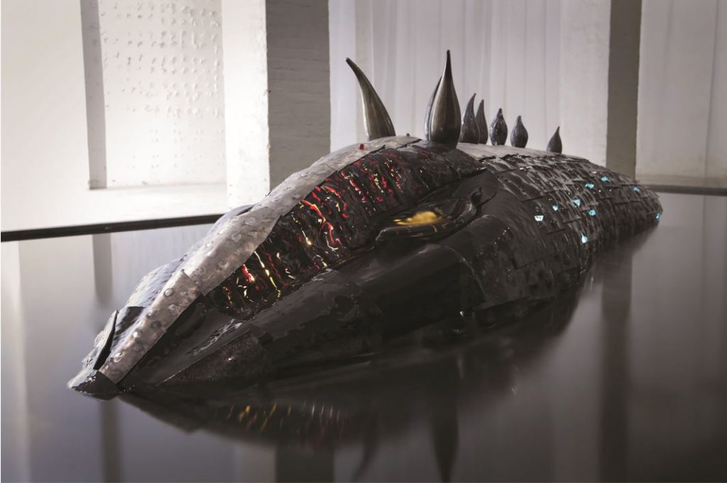 Il Mostro della Laguna l’installazione in Piazza Gae Aulenti è un’opera d’ingegno, una formidabile avventura in cui arte, design e tecnologia si fondono alla ricerca di un linguaggio nuovo per far interagire due materie antiche ed opposte: l’acqua e il vetro. Disegnata dall’architetto Simona M. Favrin, con un’epidermide di vetro di Murano, realizzata dal Maestro Nicola Moretti, che ricopre uno scheletro in acciaio realizzato da Somfer, e un’innovativa anima tecnologica realizzata con la collaborazione di Forme d’Acqua e Arentech+In Light, la creatura marina trae forma ed ispirazione dal luogo in cui ha origine, la Laguna di Venezia.