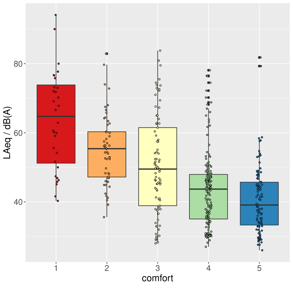 Livelli di rumore misurati dai partecipanti e calibrati dai ricercatori rispetto al livello di comfort soggettivo riferito dai partecipanti (1 = meno confortevole; 5 = più confortevole)