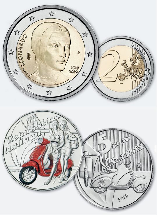 ROMA. Dallo sbarco sulla luna al muro di Berlino, dai cento anni di Fausto Coppi all’anniversario della Vespa e molto alto. E’ quanto ci riservano le nuove monete italiane che verranno emesse nel 2019, dando spazio al colore e ad innovativi inseriti in oro. Oltre alle tradizionali serie storiche, anche molti nuovi soggetti, alcuni dei quali realizzati attraverso innovative tecnologie di conio che, preservando la tradizione e la bellezza del disegno, permettono l’introduzione di importanti novità, quali l’adozione di microformati, l’introduzione ormai consolidata del colore la realizzazione per la prima volta di inserti in oro sagomato all’interno di monete in argento.
