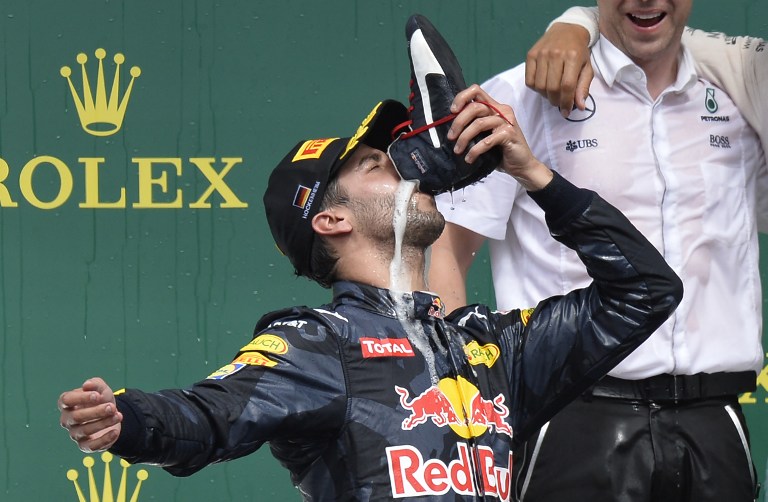 Ricciardo che mette in atto il rito dello “Shoey”