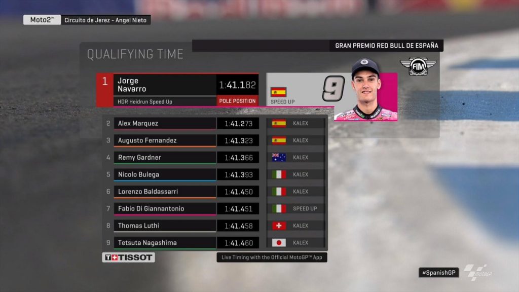 Jorge Navarro del team Speed Up si aggiudica la pole in Moto2. Il pilota iberico si aggiudica nel circuito di casa la prima pole in carriera nella categoria intermedia. Secondo Alex Marquez del team Marc VdS e Augusto Fernandez di Flex Box Hp. Primi degli italiani Nicolo Bulega del team Sky Racing Team Vr46 quinto, che ha preceduto rispettivamente in sesta e settima posizione Lorenzo Baldassarri di Flexbox Hp 40 e Fabio Di Giannantonio di Hdr Heidrun Speed Up (prima moto non Kalex tra i primi 9).