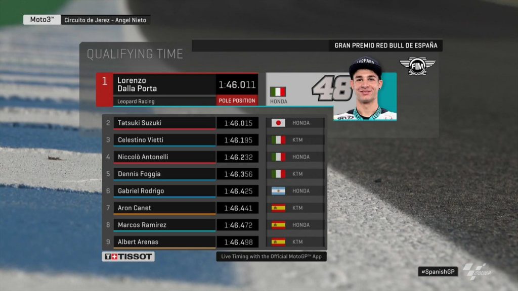 Il pilota tricolore Lorenzo Dalla Porta partirà dalla pole position, la prima in carriera, nella gara della Moto3. Dalla Porta in sella alla Honda, sarà affiancato dal giapponese Tatsuki Suzuki sempre su Honda e dall’altro italiano Celestino Vietti del SKY Racing Team VR46 su KTM. Anche il 17enne di Ciriè, in provincia di Torino, prova l’ebrezza della partenza in prima fila per la prima volta in carriera. Altri due azzurri in seconda fila con rispettivamente Niccolò Antonelli su Honda, Dennis Foggia, compagno di team di Vietti, e chiude la fila l’argentino Gabriel Rodrigo (Honda).