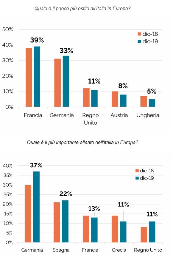 Come già lo scorso anno è la Francia del Presidente Macron ad essere percepita (da poco meno del 40%) come il principale avversario dell’Italia in Europa. Da segnalare negli ultimi due anni il passaggio di testimone rispetto alla Germania (oggi seconda al 33%). Seguono, a grande distanza, il Regno Unito (11%) e l’Austria (8%).