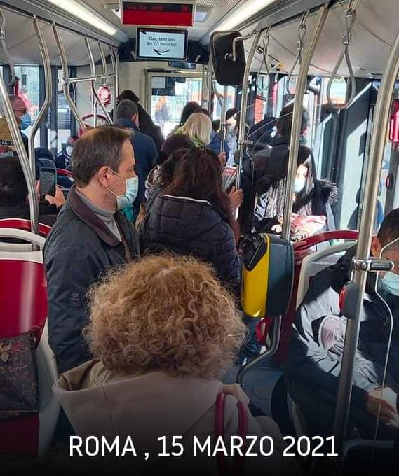 Così in un recente post: “Roma, questa è una delle tante foto che mi arrivano di questa mattina dai mezzi pubblici italiani. Zona rossa, migliaia di attività chiuse o penalizzate, ma mezzi pubblici pieni.