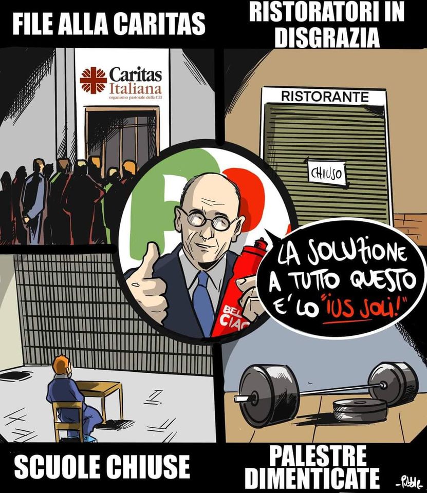 La Meloni, basita da quelle che sembrerebbero le priorità della sx, dalla sua rincara: ” Imprese allo stremo, saracinesche abbassate e cittadini in ginocchio. Ma la sinistra, sempre più lontana dalle esigenze degli italiani, pensa allo ius soli. Anche una vignetta può ben rappresentare la realtà“.