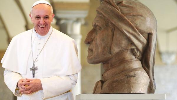 Tra le tante considerazioni e i tanti accostamenti che si possono fare, uno sembra al papa molto importante: Francesco scelse di uscire dal convento, di andare in mezzo alla gente, di entrare nelle famiglie per dialogare, predicare, convertire. Dante, pur potendo usare il latino per il suo poema, predilesse il volgare, la lingua di tutti, per spiegare il grande mistero della vita e del mondo.