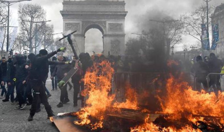 PARIGI. Riparte infuocata la protesta dei Gilet gialli. Un’inversione di tendenza netta dopo settimane di calma e di manifestazioni con poche centinaia di persone. Per la prima volta, nel pieno degli scontri, il primo ministro francese Edouard Philippe è sceso in piazza ad incoraggiare e stringere la mano agli agenti impegnati a Parigi. La scena, inedita, è avvenuta davanti al Grand Palais, a pochi metri da dove si alzano colonne di fumo dai locali e dalle edicole di giornali in fiamme, tra fumo di lacrimogeni e scene di caos. “Non si tratta né di manifestanti né di casseur, sono solo assassini”: queste le parole del primo ministro nel commentare l’incendio a un palazzo in seguito alle fiamme appiccate all’agenzia di una banca sugli Champs-Elysees .