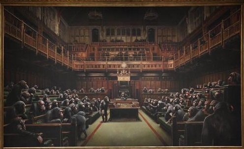 Venduto all’asta da Sotheby’s di Londra a 11,1 milioni di euro, un dipinto di Banksy, l’artista britannico noto soprattutto per i suoi provocatori murales da strada. Il quadro, “Devolved Parliament”, raffigura, in stile accademico, la Camera dei comuni di Westminster con scimpanzé come deputati. Il precedente record per un’opera di Banksy apparteneva a “Keep it Spotless”, che nel 2008 andò all’incanto per Sotheby’s a New York per 1,8 milioni di dollari. “Oggi abbiamo fatto la storia”, ha commentato il battitore quando la vendita per Banksy si è chiusa alla cifra record. Il dipinto del 2009, è largo quasi quattro metri e mezzo e alto due e mezzo. Un anno fa un’altra opera di Banksy, “Girl with Balloon” (Ragazza con palloncino) fece notizia quando, durante l’asta del solito Sotheby’s, davanti ai presenti esterrefatti, fu distrutta da un tritacarta nascosto nella cornice.
