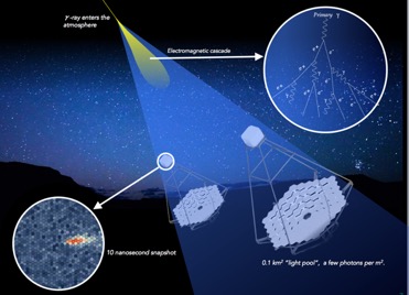 I raggi gamma di alta energia entrando in contatto con l’atmosfera terrestre producono cascate di particelle subatomiche – queste particelle altamente energetiche possono viaggiare più velocemente della velocità della luce nell’aria, dando luogo a un debole e brevissimo, dell’ordine del miliardesimo di secondo, lampo di luce bluastra. I telescopi Cherenkov, erano stati costruiti per catturare questa luce e quindi, indirettamente, rilevare i segnali in raggi gamma emessi dalle sorgenti celesti. Per questo scopo finora erano state adottate configurazioni ottiche semplificate che prevedevano un solo specchio in cui la luce venisse riflessa per essere catturata direttamente dalla camera di rilevazione.