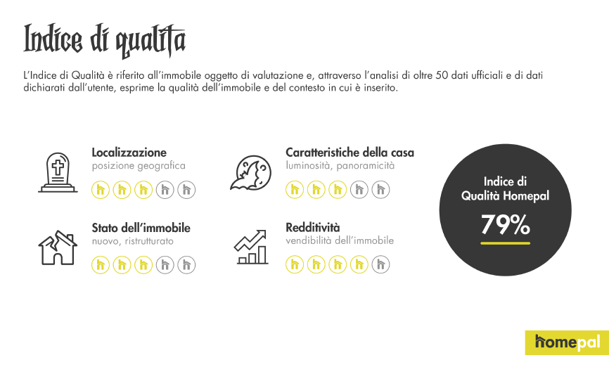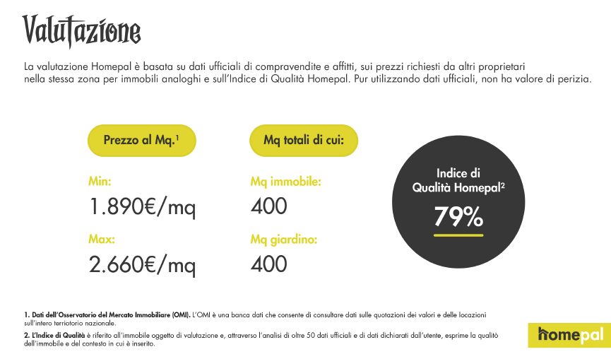 Il prezzo è stato calcolato analizzando: caratteristiche della casa (indirizzo, mq, ristrutturazione…), luminosità e panoramicità dell’immobile, dati ufficiali forniti dal Ministero delle Finanze e indice di qualità Homepal, che tramite la metodologia “big data” analizza il contesto dell’immobile valutando età degli edifici circostanti, vicinanza ai mezzi pubblici, contesto socio-demografico, dati delle compravendite e prezzi richiesti da altri proprietari nella zona per immobili simili.