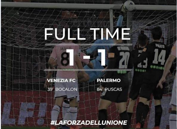 Il Venezia allo Stadio Penzo è autore di un’ottima partita contro un Palermo in piena lotta per la Promozione diretta in Serie A. I lagunari si portano in vantaggio grazie ad una splendida azione di Citro che effettua un cambio di gioco lunghissimo e preciso per Bruscagin, il terzino colpisce la palla al volo per Bocalon che come un falco anticipa la difesa avversaria e sigla il primo gol in maglia veroverde e il vantaggio. Nel secondo tempo una straordinaria prestazione del portiere del Venezia Vicario riesce a mantenere inviolata la porta dei padroni di casa, riuscendo addirittura a parare un rigore di Nestorovki al 71esimo. I rosanero aumentano la pressione nel finale e dagli sviluppi di un corner Puscas riesce a realizzare il pareggio. Un punto che non accontenta pienamente nessuna delle due compagini ma che permette al Palermo di mantenere la seconda posizione ad un punto dal Verona terzo, e al Venezia di veleggiare nella zona playout. Anche se c’è da ricordare che entrambe le squadre hanno una partita in meno rispetto ad alcune delle dirette concorrenti, avendo già disputato il turno di riposo.