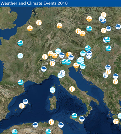 Per quanto riguarda l’Italia ISPRA, l’Istituto Superiore per la Protezione e la Ricerca Ambientale, ha prodotto e trasmesso recentemente le informazioni a livello nazionale, che contribuiscono a comporre il quadro climatico globale dell’anno 2018. Tra queste, la stima aggiornata dell’anomalia della temperatura media in Italia, che pone il 2018 al primo posto tra gli anni più caldi di tutta la serie storica e alcuni dati relativi agli eventi estremi di temperatura, vento e precipitazioni che hanno colpito l’Italia nel corso dell’anno. Tra gli altri, sono stati segnalati gli eventi alluvionali che hanno colpito le Valli di Fiemme e di Fassa, la provincia di Belluno e la provincia di Palermo (rispettivamente nei mesi di luglio, ottobre e novembre), la tempesta di vento che ha interessato praticamente l’intero territorio nazionale alla fine di ottobre e la lunga e intensa ondata di caldo che ha investito l’Italia per due settimane tra fine di luglio e metà agosto.