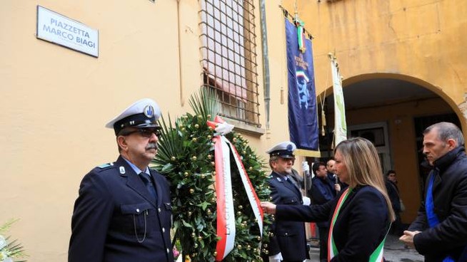 Nella piazzetta intitolata al suo nome, a pochi passi da dove avvenne l’omicidio, il Comune di Bologna, insieme ai sindacati, il prefetto, il questore e le altre autorità cittadine, ha deposto una corona di fiori, alla presenza dei familiari di Biagi, la moglie Marina e il figlio Lorenzo.