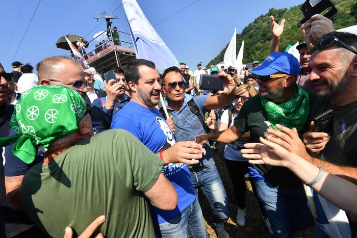 Ipotesi che non dispiace per nulla a Forza Italia (anche se si registrano distinguo da parte di alcuni esponenti azzurri), segno evidente di una sintonia ritrovata nel centrodestra dopo l’incontro tra lo stesso Salvini e Silvio Berlusconi. “Questo governo e la maggioranza dei perdenti che lo sostiene non ha alcuna legittimità per varare una misura che incide nel tessuto vitale della democrazia: è giusto che se non esiste in Parlamento uno schieramento ampio e trasversale siano gli italiani a decidere”. Contro quello che la Lega definisce l’inciucio Pd-M5s, Salvini morde il freno: “Se cinque regioni lo approvano entro settembre si va al referendum in primavera”. Ma torniamo ai militanti, tra loro tante scritte, inneggianti al loro ‘Capitano’ e soprattutto contro il leader degli ex alleati. Su uno striscione fatto in casa, appeso tra due tende, parafrasando un celebre hashtag lanciato da Renzi , si legge «Di Maio stai sereno». Ma nel mirino dei leghisti finisce anche Sergio Mattarella: «Questo Presidente della Repubblica mi fa schifo! Mi fa schifo chi non tiene in conto del 34% dei cittadini», si sfoga il deputato leghista Vito Comencini, intervenendo all’assemblea della Lega Giovani.