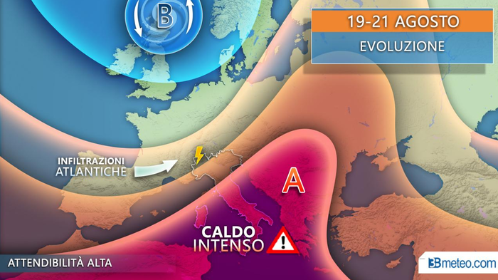“La prossima settimana, almeno la prima parte, vedrà invece l’ennesima rimonta dell’anticiclone africano, responsabile di una nuova ondata di calore – avverte Ferrara -. Interessato soprattutto il Centrosud con picchi nuovamente di oltre 34-35°C sulle aree interne, qualche grado in meno lungo le coste ma con afa in aumento. Caldo afoso anche al Nord, che tuttavia verrà lambito dalle correnti atlantiche in scorrimento oltralpe. Quest’ultime saranno così responsabili di qualche rovescio o temporale dapprima su Alpi e Piemonte, successivamente non escluso anche su Prealpi e Pianura Padana, sebbene in modo molto occasionale. In particolare i temporali avranno maggiori chances di svilupparsi da mercoledì 21 al Nord con marginale interessamento anche delle regioni del Centro dal 23-24 agosto. Data la presenza di aria calda e umida, non si escludono fenomeni anche di forte intensità, per quanto di breve durata e molto localizzati. Ricordiamo infatti che questo non significa che pioverà 24 ore su 24, ma che oltre al sole si dovrà mettere in conto la possibilità di qualche temporale”.
