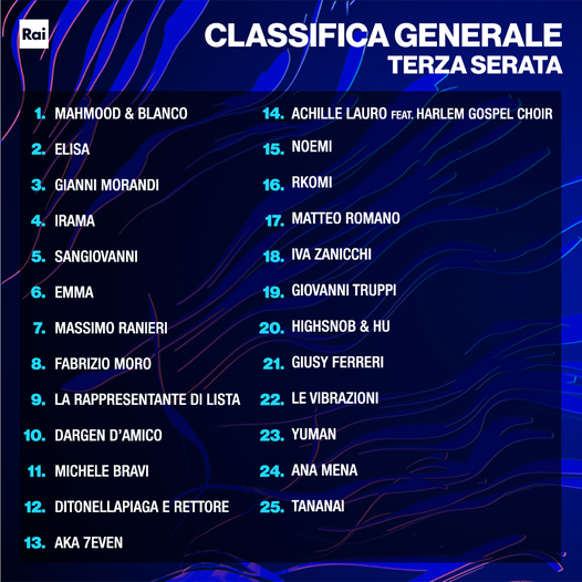 La classifica generale alla fine della terza serata, dopo il voto della stampa alle prime due sere e del televoto e della giuria demoscopica 1000 ieri sera, è così composta: in vetta il duo Mahmood & Blanco con ‘Brividi‘, al secondo posto Elisa con ‘O forse sei tu‘, mentre al terzo posto c’è l’inossidabile Gianni Morandi con ‘Apri tutte le porte‘, brano scritto da Jovanotti.