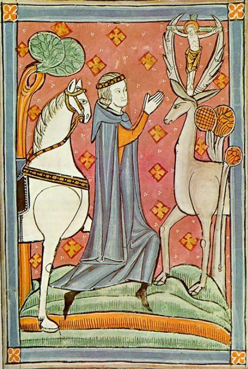 Secondo la Leggenda Aurea un giorno Placido sta inseguendo un cervo mentre va a caccia, quando questo si ferma di fronte ad un burrone e si volse a lui mostrando tra le corna una croce luminosa sormontata dalla figura di Gesù che gli dice: “Placido, perché mi perseguiti? Io sono Gesù che tu onori senza sapere”. Dopo essersi ripreso dallo spavento, Placido rientra a casa e narra tutto alla moglie, la quale gli riferisce di aver avuto quella notte una visione nella quale uno sconosciuto le preannunciava che l’indomani ella si sarebbe recata da lui con il marito. Placido, la moglie e i due figli si recano l’indomani dal vescovo, si convertono e si fanno battezzare. Placido riceve il nome di Eustachio (dal greco Eustáchios, cioè “che dà buone spighe”), la moglie quello di Teopista (dai termini greci théos e pístos, cioè “credente in Dio”), ed i figli, uno Teopisto e l’altro Agapio (dal greco Agápios, cioè “colui che vive di carità”).