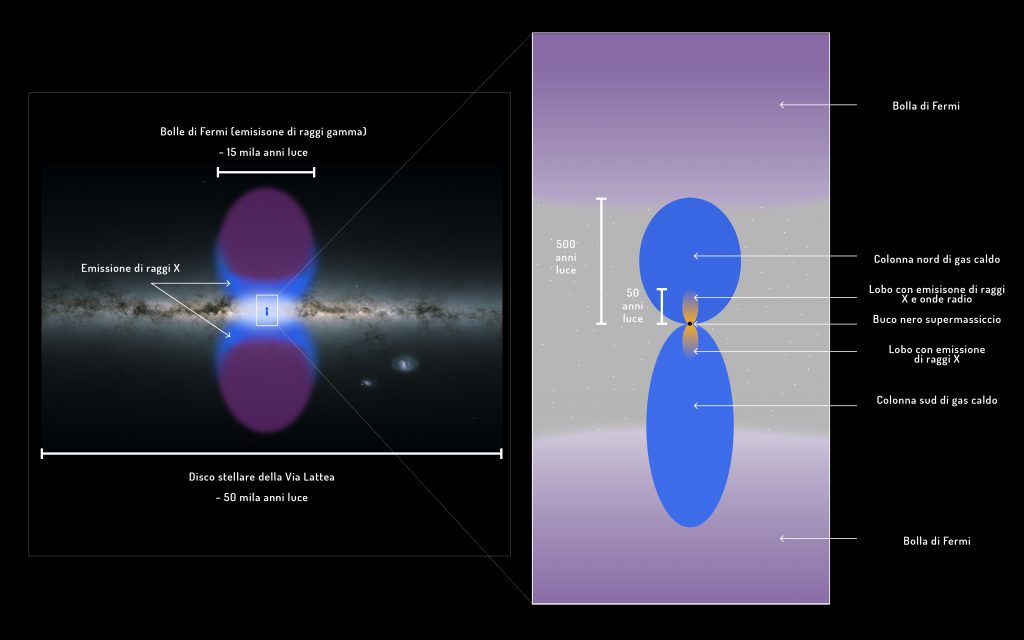 La mappa elaborata dai ricercatori rivela la presenza di estesi canali di gas ad alta temperatura delle dimensioni di alcune centinaia di anni luce che scorrono perpendicolarmente al piano della Via Lattea, uno in direzione nord e uno in direzione sud. Gli scienziati pensano che queste strutture stiano trasportando materia ed energia dal cuore della nostra Galassia fino alla base delle bolle di Fermi, rifornendole di nuovo materiale. La scoperta chiarisce in che modo l’attività del nucleo della nostra Galassia, sia presente che passata, è connessa all’esistenza di strutture più grandi attorno ad essa. Il deflusso di gas ed energia individuato potrebbe essere una testimonianza del passato della nostra Galassia, quando l’attività delle sue regioni centrali era molto più diffusa e potente, oppure potrebbe dimostrare che anche le galassie “non attive” – ovvero quelle che ospitano un buco nero supermassiccio relativamente quieto e mostrano una moderata attività di formazione stellare come la Via Lattea – possono comunque produrre enormi flussi di massa ed energia.