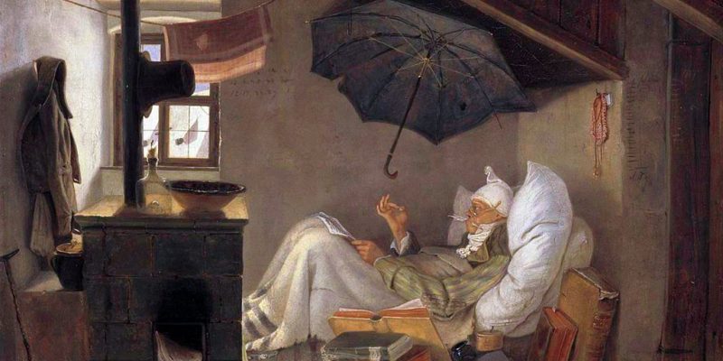 Ringraziamo Francesco Provinciali per averci fornito così tanti spunti di riflessione e che ci ha pregato di inserire una specifica immagine a corredo del testo in quanto l’olio su tela, che ci ha indicato, ha un significato profondo ed idoneo all’elaborato, il quadro si intitola: ‘ Il poeta povero’ è del 1839 ed è di Karl Spitzweg (Monaco 1808-1885). L’ opera é esposta alla ‘Alte Nationalgalerie’ di Berlino.