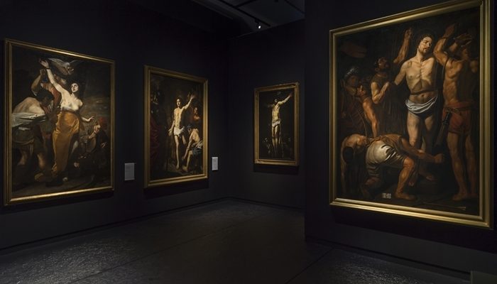 A confronto sei opere del Merisi, e 22 quadri di artisti napoletani, con un riscontro visivo tra le opere raccolte in Sala Causa che permette riflessioni e chiarimenti immediati. Il primo, potente dialogo è tra La Flagellazione, conservata a Capodimonte, che Caravaggio realizzò per la chiesa partenopea di San Domenico, e la Flagellazione del Musée des Beaux-Arts di Rouen, assente da Napoli da 35 anni e in arrivo dopo un restauro. Il raffronto si arricchisce dell’esposizione di una copia del dipinto di Rouen assieme ad alcuni quadri strettamente ispirati ad esse, quali la Flagellazione, restaurato per l’occasione, attribuito a Fabrizio Santafede di Palazzo Abatellis; il Cristo alla colonna di Battistello Caracciolo (Capodimonte) e quello di Jusepe de Ribera (Complesso Monumentale dei Girolamini). Esposte inoltre a confronto con la Salomè di Caravaggio custodita a Londra (National Gallery) e quella di Madrid (Palacio Real), alcune grandi interpretazioni di Battistello Caracciolo (Museo de Bellas Artes, Siviglia), e di Massimo Stanzione per la prima volta a Napoli.
