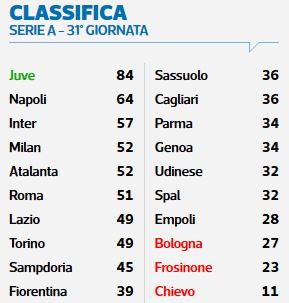 PROSSIMO TURNO 32° Giornata: Spal-Juventus (Sabato 13 Aprile, ore 15), Roma-Udinese (Sab 13, ore 18), Milan-Lazio (Sab 13, ore 20:30), Torino-Cagliari (Domenica 14 Aprile, ore 12:30), Sassuolo-Parma (Dom 14, ore 15), Fiorentina-Bologna (Dom 14, ore 15), Sampdoria-Genoa (Dom 14, ore 15), Chievo-Napoli (Dom 14, ore 18), Frosinone-Inter (Dom 14, ore 20:30), Atalanta-Empoli (Lunedì 15 Aprile, ore 20:30).