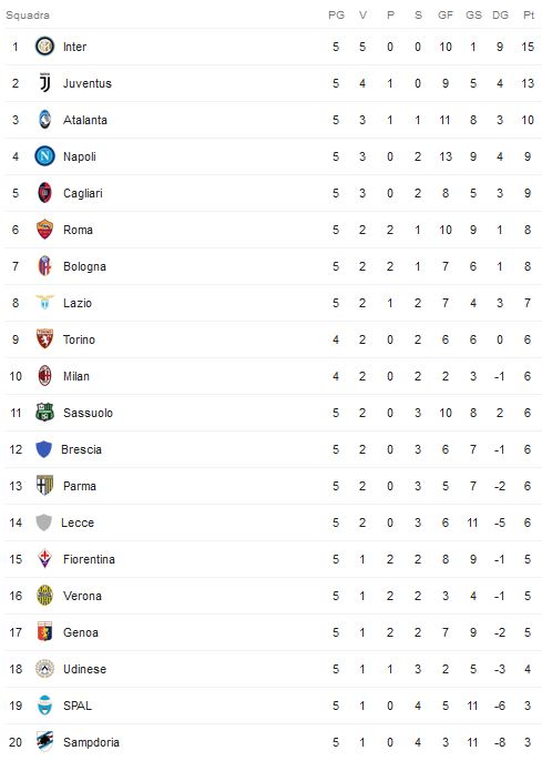 Da registrare in serata il colpo del Cagliari a Napoli (0-1). Il gol di Castro all’89’. Ko casalingo anche per la Roma, battuta nel pomeriggio per 2-0 dall’Atalanta con gol di di Zapata e De Roon. Vittorie per Fiorentina (2-1 alla Sampdoria), Parma (1-0 al Sassuolo) e Lecce, corsaro a Ferrara con la Spal per 3 a 1. Finisce 0-0 tra Genoa e Bologna. Nella giornata di ieri avevano pareggiato per 0-0 Verona e Udinese, mentre la Juve aveva vinto faticando a Brescia per 2 a 1. Domani sera concluderà il tabellone della quinta giornata la sfida all’Olimpico tra Torino e Milan.