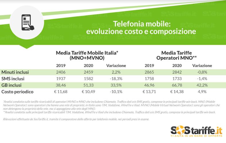 Quello che volge al termine è stato un anno ricco di occasioni per chi volesse cambiare operatore di telefonia mobile o individuare un’offerta conveniente per il proprio smartphone. Nel 2020, infatti, rispetto al 2019 i prezzi delle promozioni sono calati e i pacchetti “all inclusive”, sempre più diffusi, si sono arricchiti di GB. L’ ultimo osservatorio SOStariffe.it ha analizzato l’evoluzione delle offerte per la telefonia mobile tra il 2019 e il 2020, confrontandone il costo e la dotazione di GB, minuti e messaggi inclusi.
