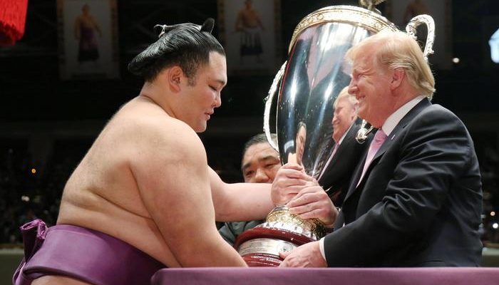 Al termine, come vuole la tradizione, si è tolto le scarpe, ha indossato pantofole di colore scuro ed è salito sul ring per consegnare al vincitore, Asanoyama, la ‘United States President’s Cup”, un trofeo alto 137 centimetri e pesante 30 chili. La visita di Trump nel Sol Levante, cominciata ieri, durerà fino a martedì. Domani il presidente sarà il primo leader mondiale ad incontrare il nuovo imperatore giapponese Naruhito.