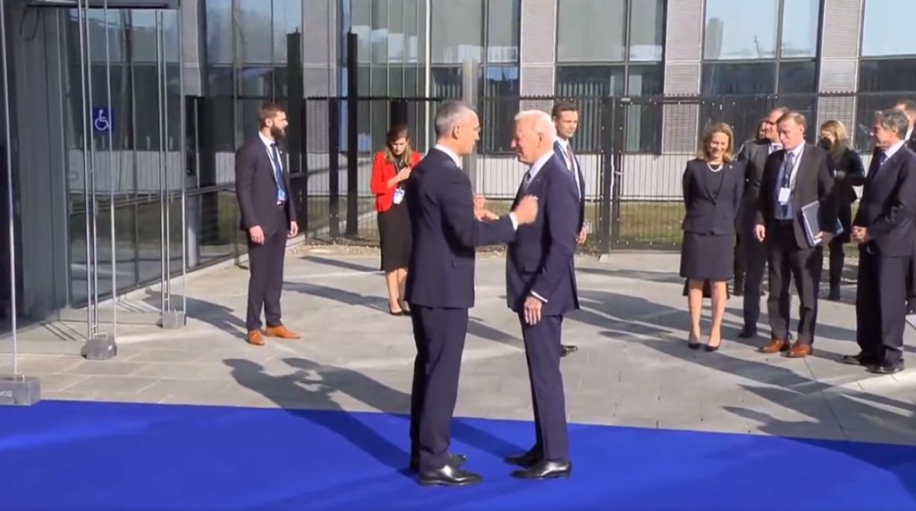 Il segretario generale della Nato Stoltenberg accoglie il presidente americano Joe Biden al suo arrivo al Quartiere generale della Nato a Bruxelles