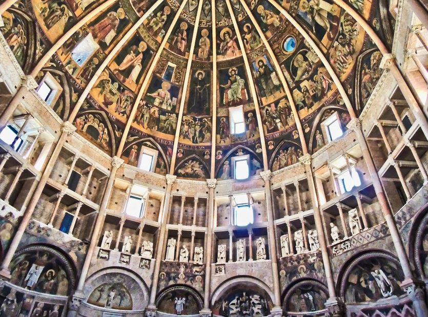 Partiamo dal cuore della città, piazza del Duomo dove a spiccare tra i palazzi d’epoca è proprio la cattedrale di Santa Maria Assunta. La costruzione, insieme al Battistero, rappresenta uno dei simboli di Parma e il principale luogo di culto per i cittadini. Costruita nel corso dell’XI e XII secolo la chiesa è un magistrale esempio di stile romanico. La facciata a capanna presenta archi e colonne che formano tre diversi ordini di logge, mentre all’interno si possono riconoscere le ristrutturazioni rinascimentali e gli affreschi gotici. Qui sono conservati alcuni capolavori del Correggio, di Benedetto Antelami e di altri maestri del nostro Rinascimento. Accanto c’è il Battistero di San Giovanni dalla caratteristica pianta ottagonale. Costruito in stile romanico gotico lungo il corso del XII e XIII secolo, è rivestito da prezioso marmo rosa proveniente da Verona. Opera dell’artista Benedetto Antelami, il battistero è un vero e proprio capolavoro d’arte. All’esterno è decorato da archi, colonne, fregi e bassorilievi che rendono l’enorme struttura molto elegante. Da non perde è l’interno con le sue sedici arcate e le nicchie completamente affrescate, la ricchezza delle decorazioni e delle iconografie vi lasceranno senza fiato.