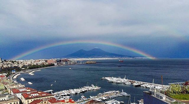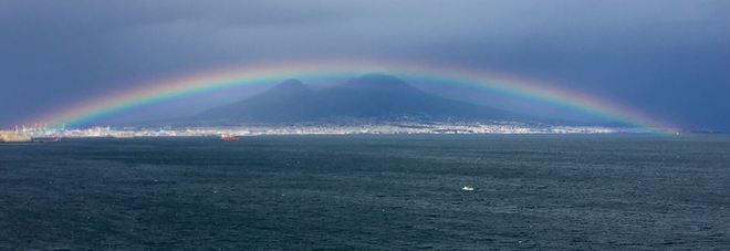 NAPOLI. Non c’è bisogno di Photoshop. E’ tutto vero. Dopo un po’ di pioggia pomeridiana, verso il tramonto un grande arcobaleno ha abbracciato il golfo di Napoli e ha fatto da “corona” al Vesuvio.