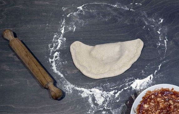 Con un mattarello stendiamo le palline quasi a creare una pizza di piccole dimensioni e condiamole con i nostri ingredienti (senza esagerare col ripieno per evitare fuoriuscite in fase di cottura), quindi chiudiamo il tutto a metà (fino ad ottenere un semicerchio) avendo premura di chiudere bene i bordi, con le mani o con una forchetta.