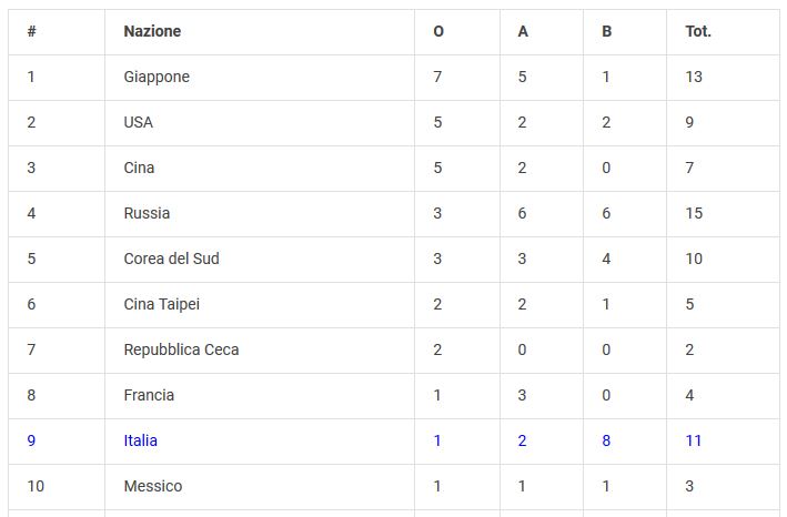 NEL MEDAGLIERE L’ITALIA E’ NONA