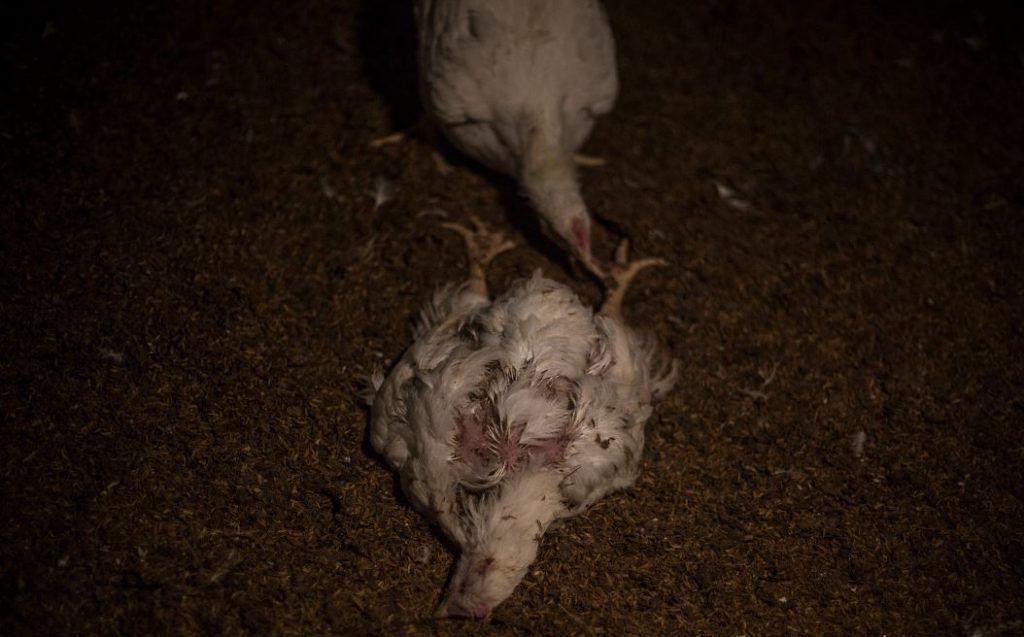 Nel filmato si vedono animali che non riescono a stare in piedi a causa delle enormi dimensioni che hanno raggiunto in soli 30 giorni, parzialmente o completamente ustionati a causa dell’ammoniaca emanata dal terreno per via dell’accumulo di feci e deiezioni mai pulite, volatili agonizzanti che crollano a terra, sotto il proprio peso sovradimensionato, non riuscendo a raggiungere gli abbeveratoi, e inesorabilmente finiscono per morire di fame e di sete.