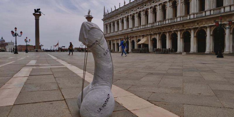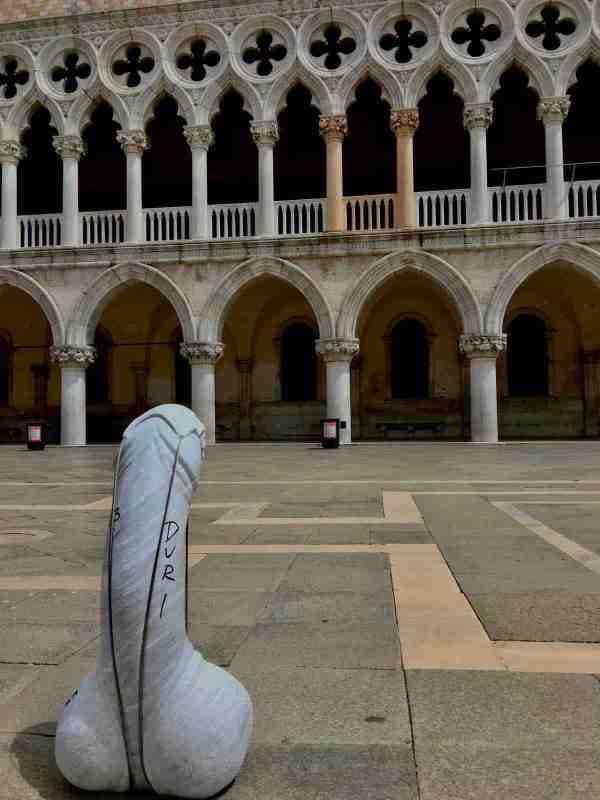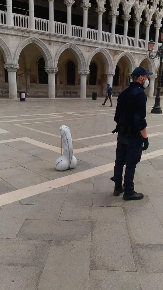 Ieri mattina a Venezia nel bel mezzo della piazza simbolo della città lagunare, piazza San Marco, di fronte alla celebre porta della Carta di palazzo Ducale i veneziani hanno fatto trovato un’insolita opera d’arte: si tratta di un pene di marmo, alto circa mezzo metro, coperto da alcune scritte con pennarello indelebile nero. Sul glande è stata posta una mascherina, anch’essa di marmo, alle cui estremità sono stati posti dei cavi d’acciaio a simboleggiare gli elastici in dotazione nei classici dispositivi di protezione individuale.