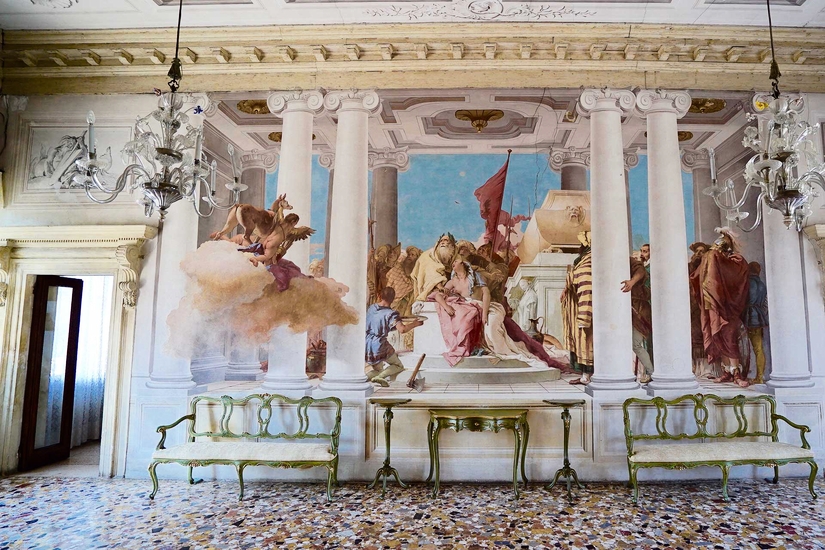 Il visitatore può quindi intraprende un viaggio verso una visione del mondo mitologica, gli affreschi delle 5 sale della palazzina possono essere definite tra le più significative opere di Giambattista Tiepolo.