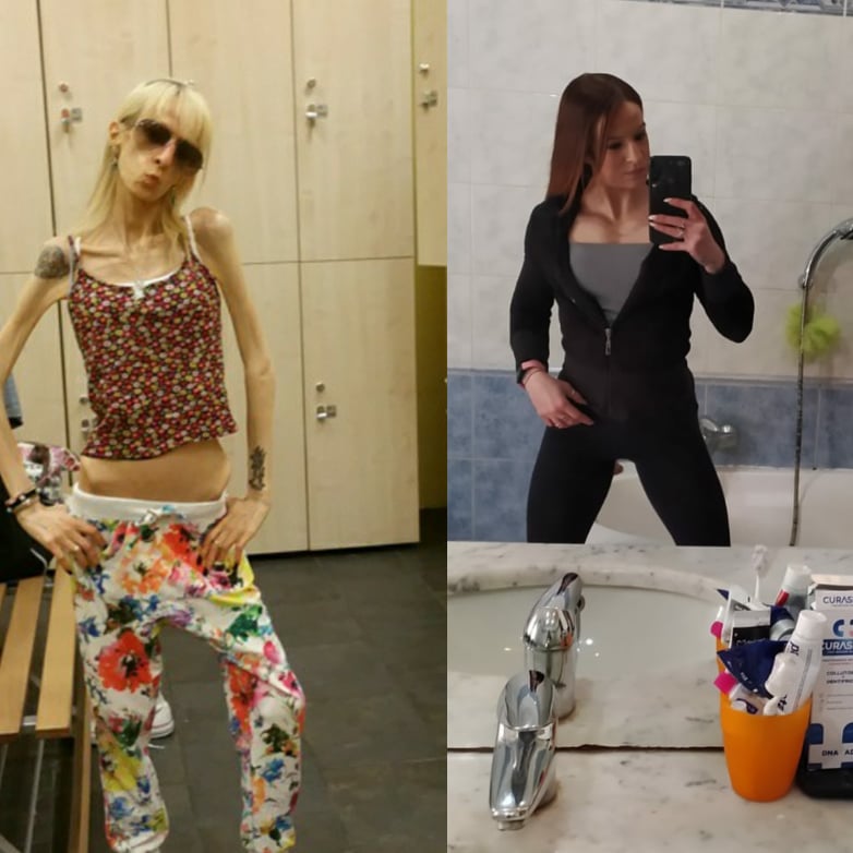 Io a differenza di altre ragazze anoressiche non ho mai digiunato e non ho mai vomitato, ma facevo iperattività, camminavo sempre, non stavo mai ferma, in Palestra facevo solo aerobica, cercavo qualsiasi mezzo mi facesse bruciare le calorie del cibo ingerito. Durante la malattia ho perso i capelli la cosa che amo di più, Sono arrivata al punto di balbettare, ogni giorno mi fotografavo anche 100-200 foto al giorno. Per controllare, vedere se ingrassavo. Avevo la fissa delle maniglie dell’amore, ero pelle ed ossa, eppure me le vedevo.