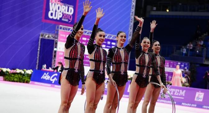La prima volta per premiare la splendida medaglia d’oro conquistata dalla Squadra Nazionale nella finale di specialità alle 5 palle. Le Farfalle capitanate da Alessia Maurelli con Martina Centofanti, Agnese Duranti, Martina Santandrea, Letizia Cicconcelli e Anna Basta hanno vinto grazie al punteggio di 25.400, lasciandosi alle spalle la Russia (25.300) e il Giappone (24.950). Il tricolore poi ha fatto il bis alla Vitrifrigo Arena per celebrare la medaglia d’argento di Alexandra Agiurgiuculese nella finale di specialità individuale alle clavette. L’aviere dell’Aeronautica Militare è salita sul secondo gradino del podio grazie al punteggio di 20.950, con alle spalle la bielorussa Harnasko nella final eight vinta dalla russa Dina Averina.