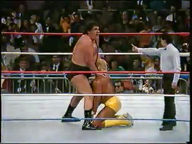 Fischi assordanti all’ingresso di Andre The Giant, cori e canti per spingere Hulk Hogan verso la clamorosa impresa. Abbattere il gigante. Hogan sembra determinatissimo e parte forte, provando a sfruttare la limitatissima mobilità dell’avversario. Ma commette l’errore di strafare. Prova infatti a sollevare il grosso Andre per un’improbabile Bodyslam. Come prevedibile, il peso del gigante travolge l’Hulkster, che finisce al tappeto e a mala pena esce dal pin al conto di due. Inizia il dominio di Andre The Giant. Bodyslam, Chop, calci. Hogan è in balìa del gigante. Andre prova anche a schiacciare Hulk all’angolo col suo peso. Arriva comunque una reazione del campione, ma a nulla servono i vari tentativi di Clothesline. Andre non va giù neanche con le cannonate. Prova allora con delle Chop all’angolo, ma dopo un buon momento subisce un Big Boot e torna a dominare Andre, che chiude Hogan nella Bear Hug. Ma il campione non molla e riesce a non cedere. Altra reazione a suon di Clothesline, ma l’unica davvero efficace è proprio dello sfidante, che manda ancora Hulk al tappeto. La sfida si sposta fuori dal ring, dove Hogan riesce però a far schiantare il rivale contro il ring post.