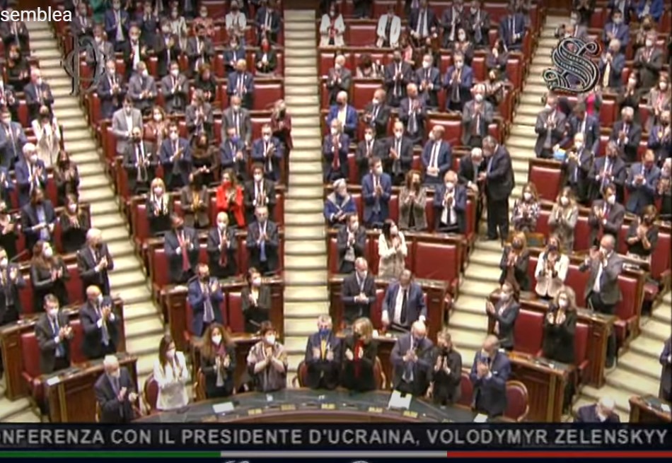 Dura poco più di 10 minuti l’intervento di Volodymyr Zelensky in collegamento con il Parlamento italiano: a Montecitorio ci sono deputati e senatori e tutto il governo, come e più di una seduta comune per eleggere il presidente della Repubblica. E sono 10 minuti di emozioni.